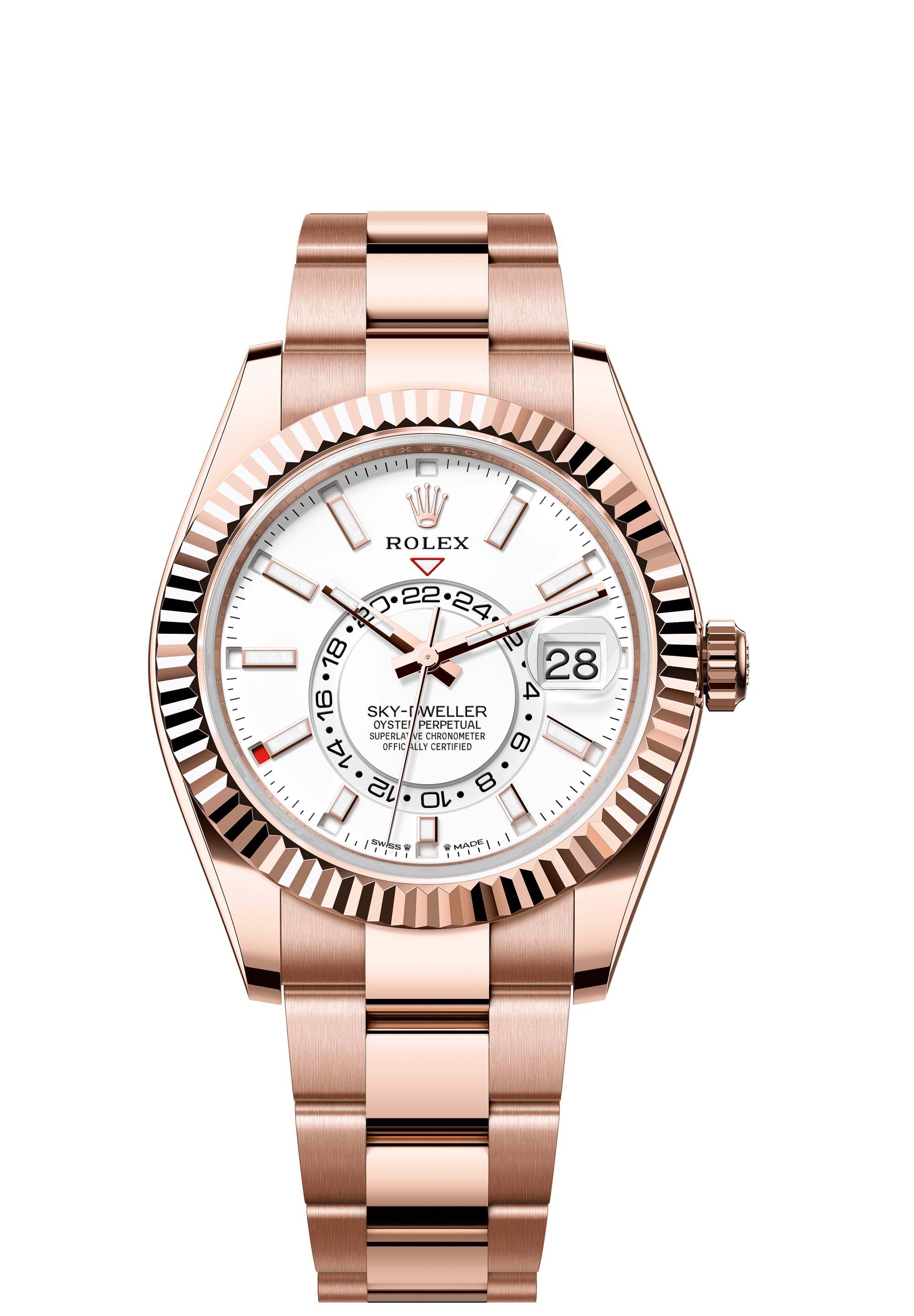The Oyster Perpetual Sky-Dweller in 18 ct Everose gold with an intense white dial and an Oyster bracelet.