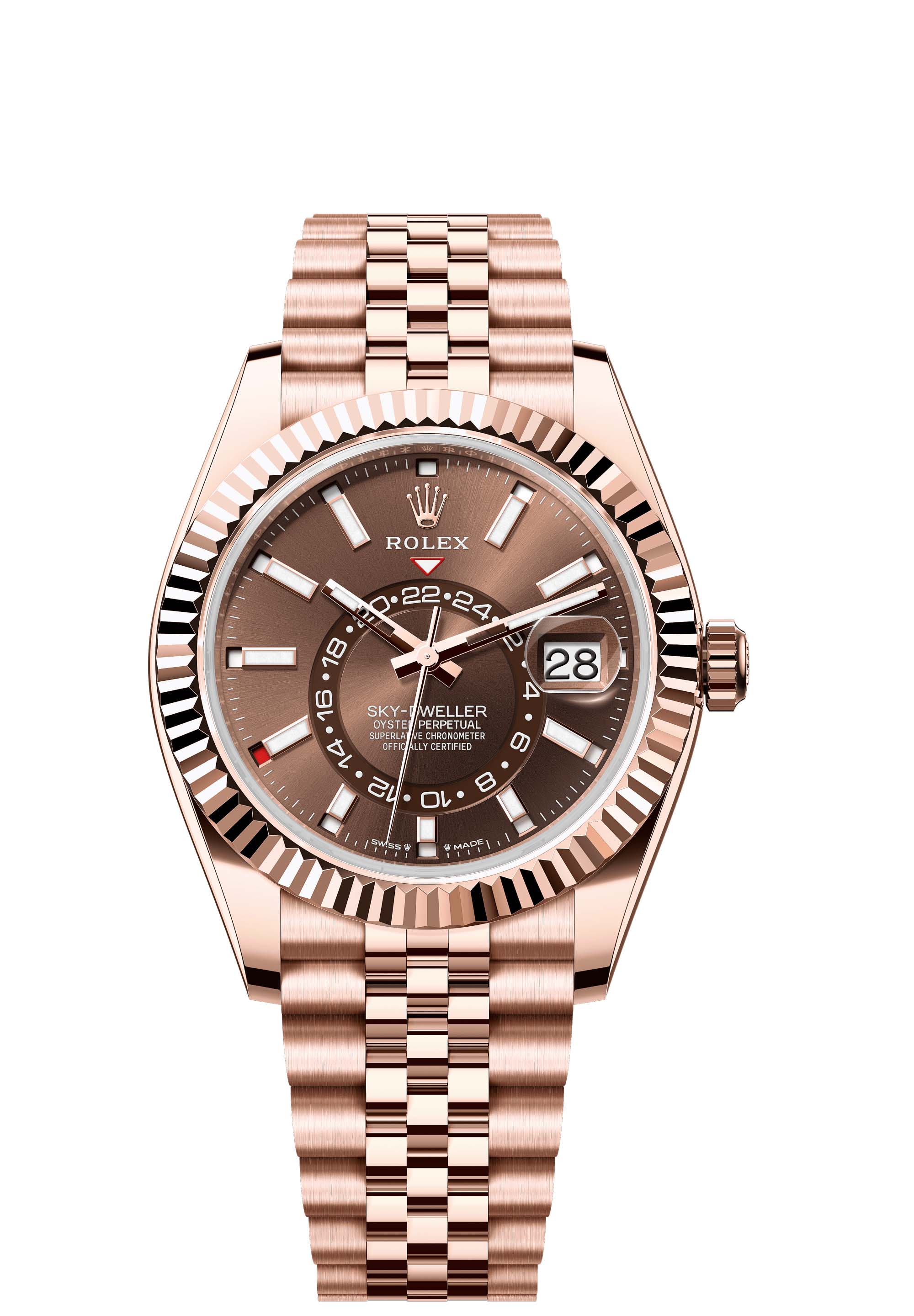 The Oyster Perpetual Sky-Dweller in 18 ct Everose gold with a chocolate dial and a Jubilee bracelet.