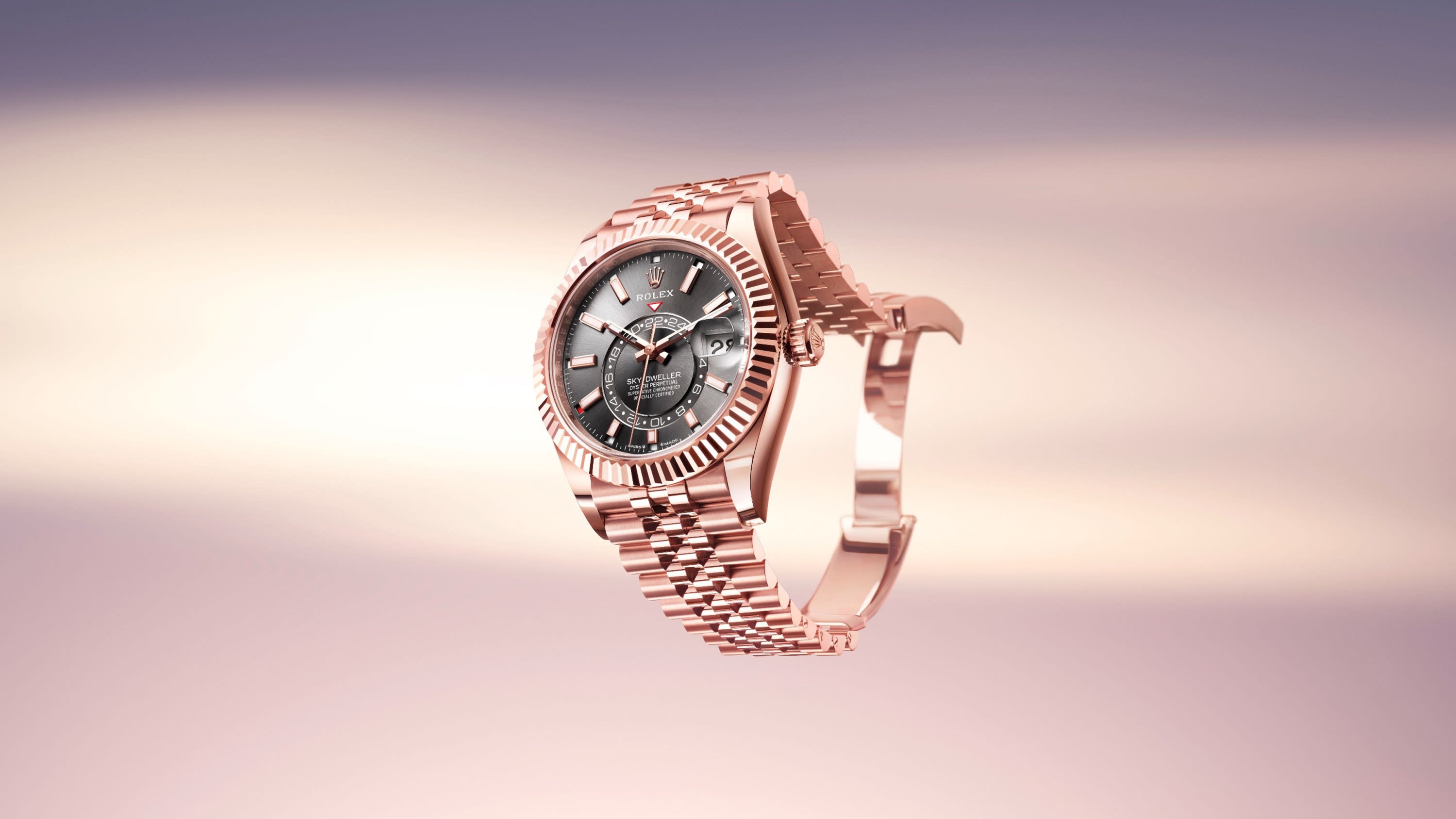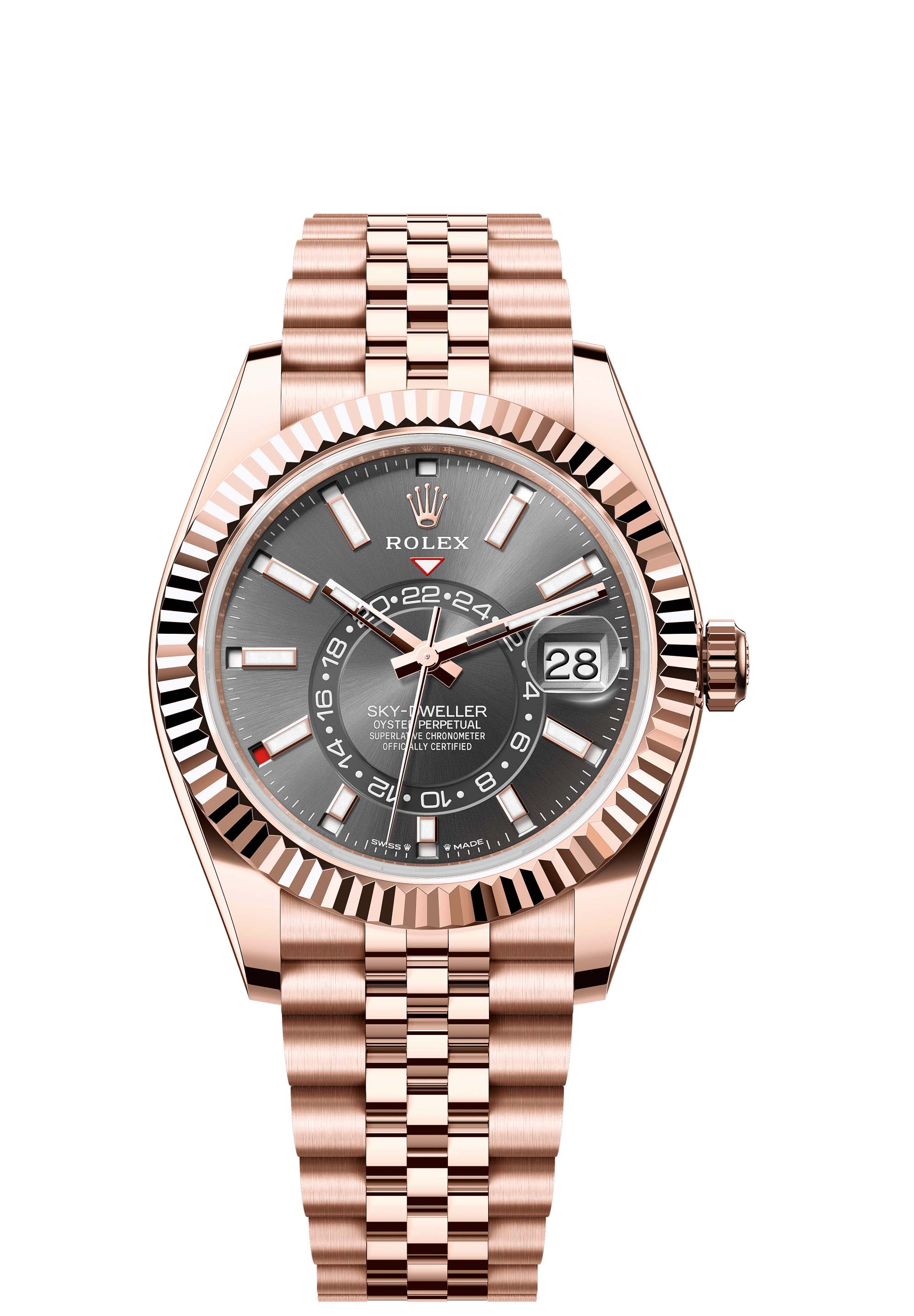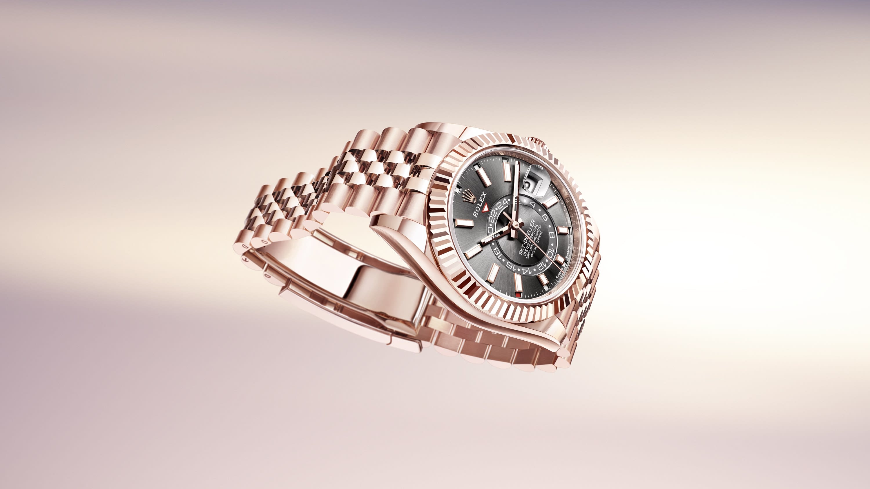 The Oyster Perpetual Sky-Dweller in 18 ct Everose gold with a slate dial and a Jubilee bracelet.