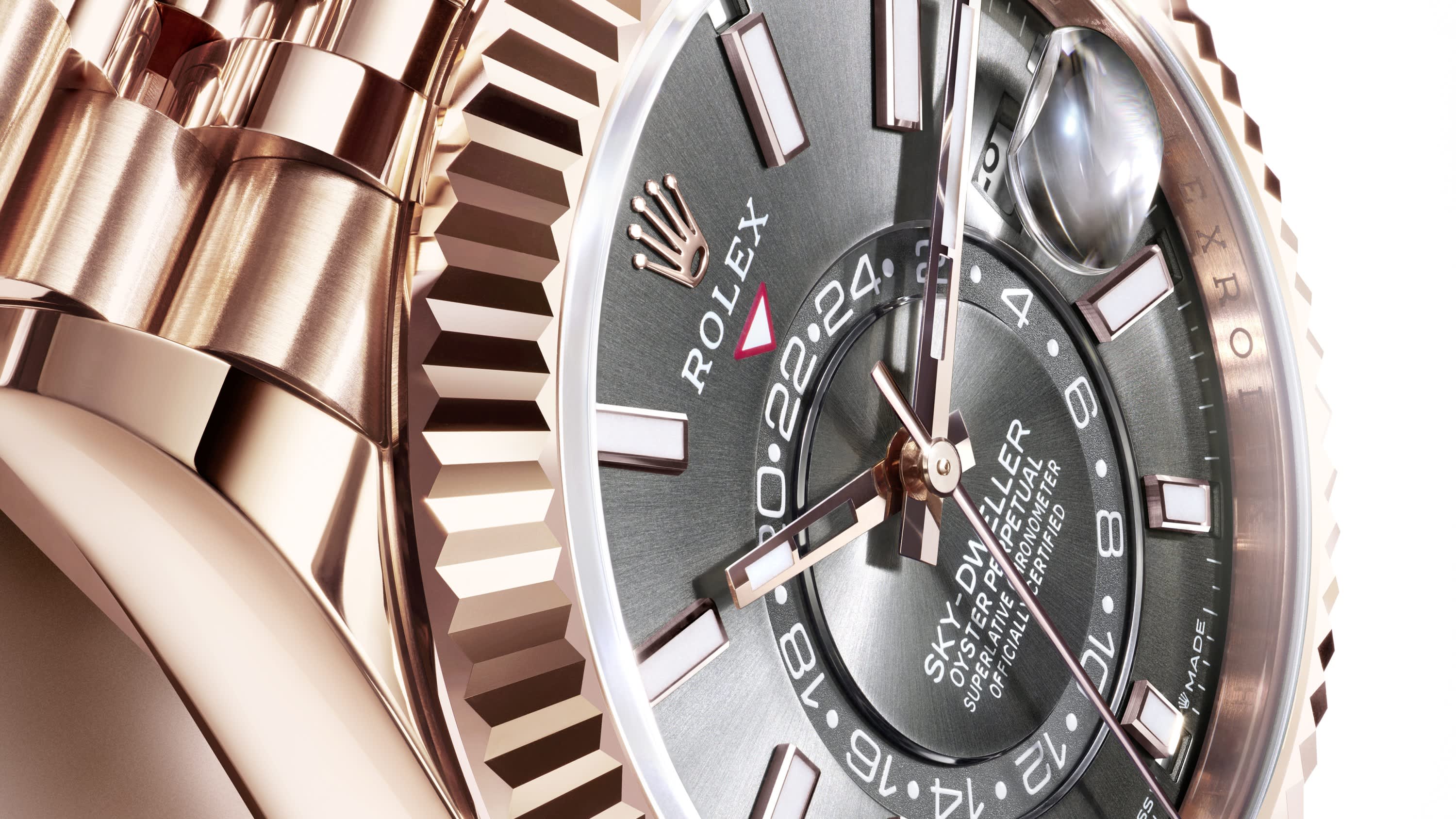 The Rolex fluted bezel is a mark of distinction. Originally, the fluting of the Oyster bezel had a functional purpose: it served to screw the bezel onto the case, helping to ensure the waterproofness of the watch. It was therefore identical to the fluting on the case back, which was also screwed onto the case for waterproofness, using specific Rolex tools. Over time, the fluting became an aesthetic element, a genuine Rolex signature feature. Today the fluted bezel is a mark of distinction, always in gold. The Sky-Dweller is equipped with a mechanism of interaction between the rotatable bezel, the winding crown and the movement: the Ring Command system, which allows the user to select the watch's functions one-by-one and to set them easily, quickly and securely.