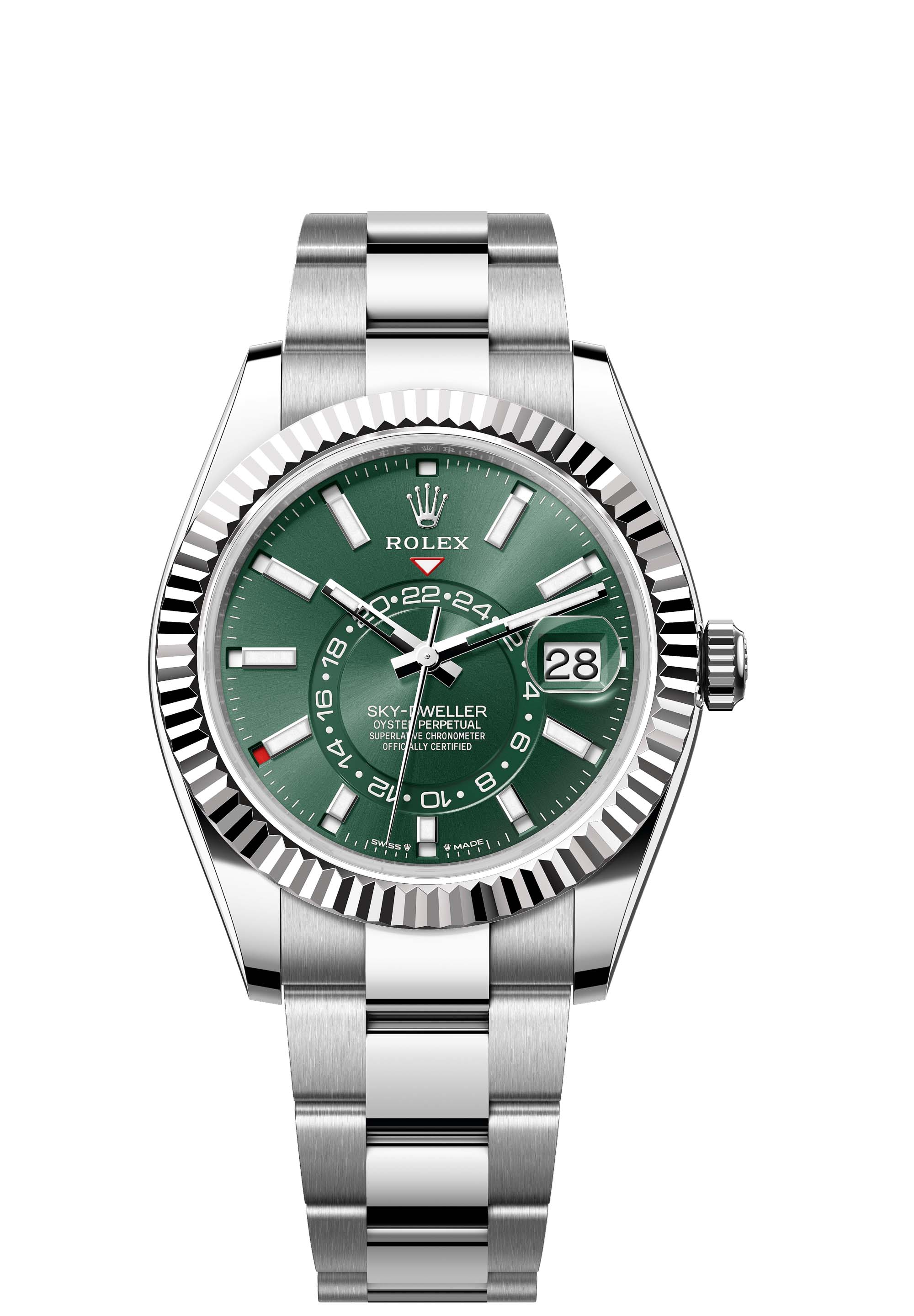 The Oyster Perpetual Sky-Dweller in Oystersteel and white gold with a mint green dial and an Oyster bracelet.