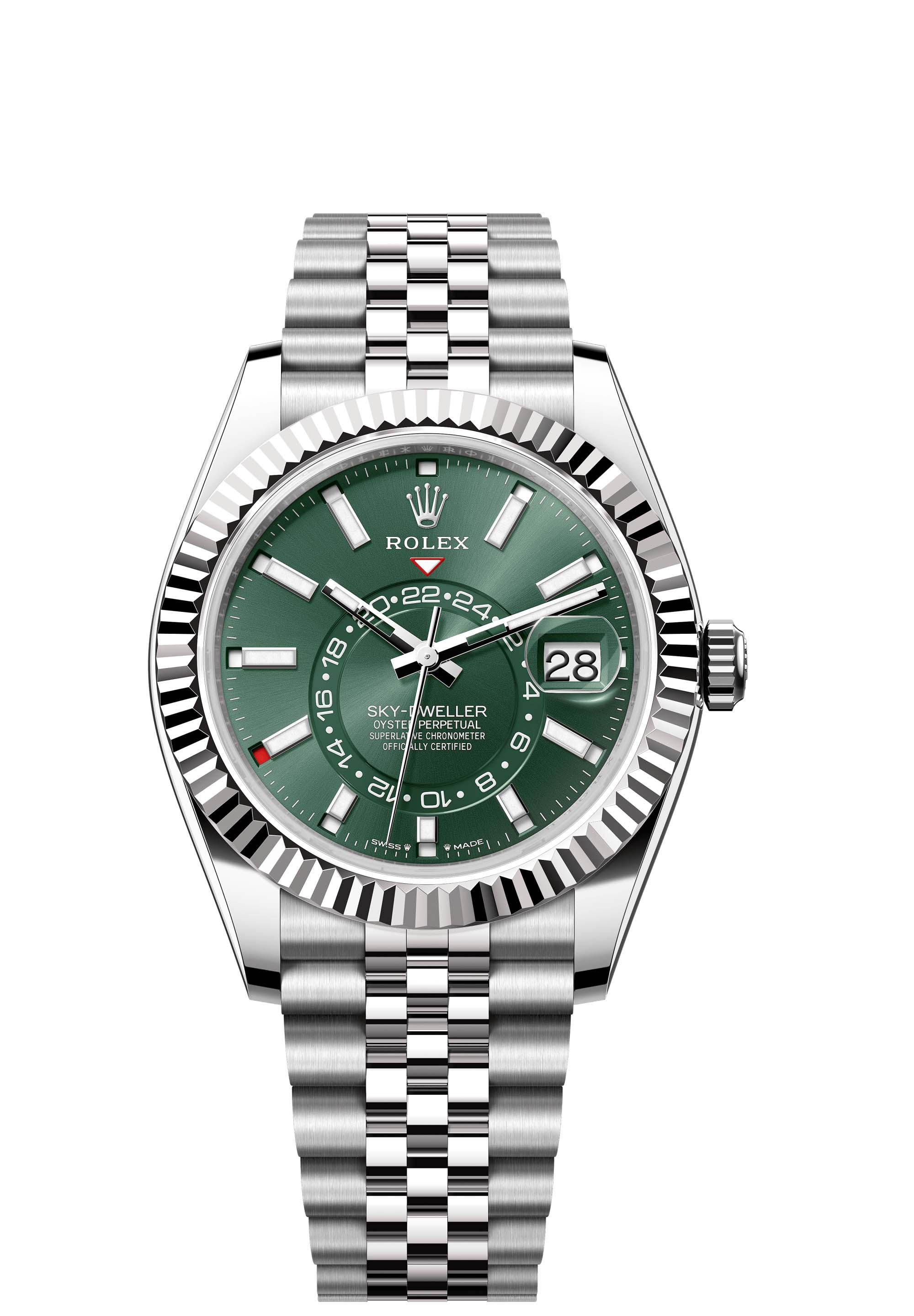 The Oyster Perpetual Sky-Dweller in Oystersteel and white gold with a mint green dial and a Jubilee bracelet.