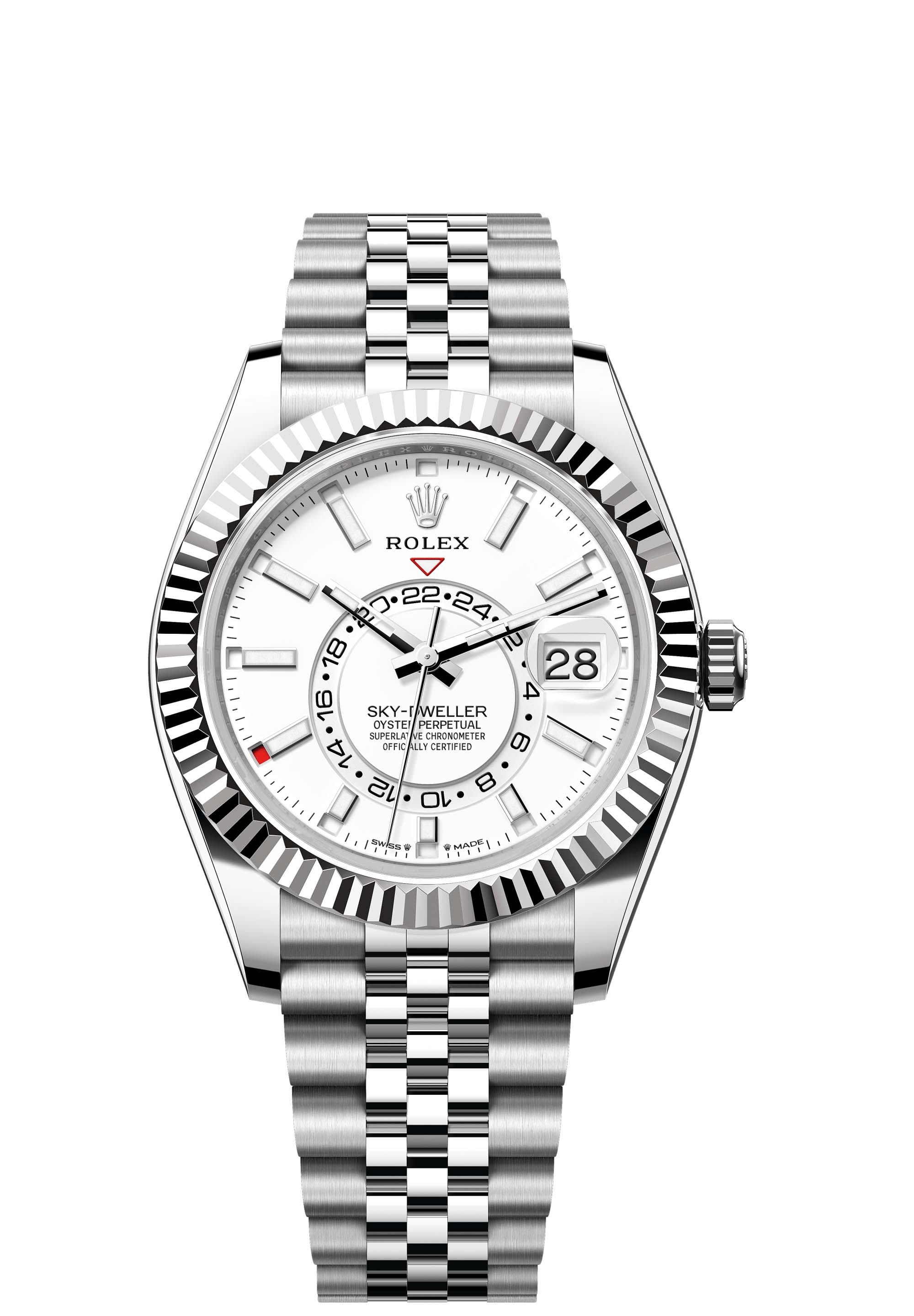 The Oyster Perpetual Sky-Dweller in Oystersteel and white gold with an intense white dial and a Jubilee bracelet.
