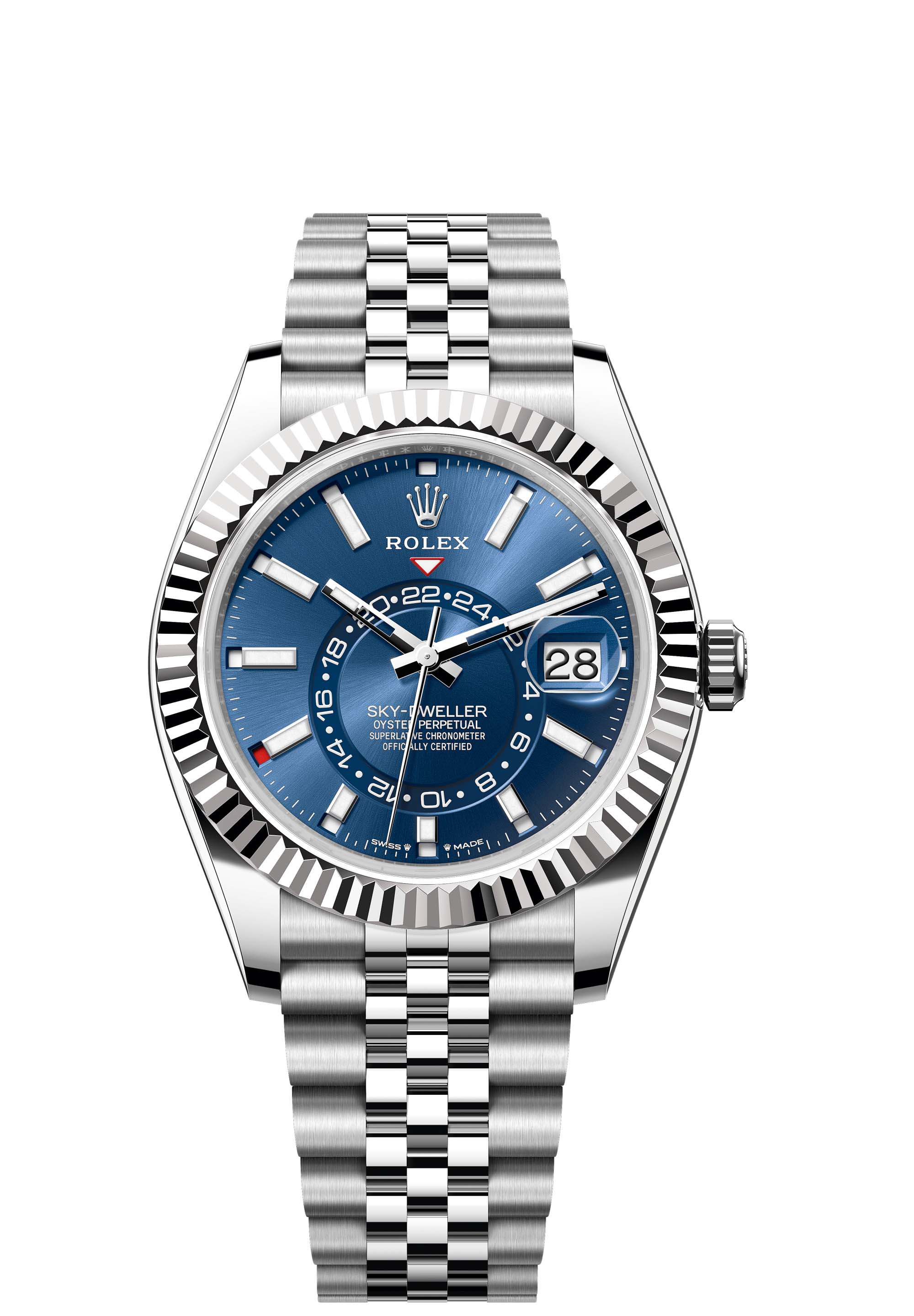 The Oyster Perpetual Sky-Dweller in Oystersteel and white gold with a bright blue dial and a Jubilee bracelet.