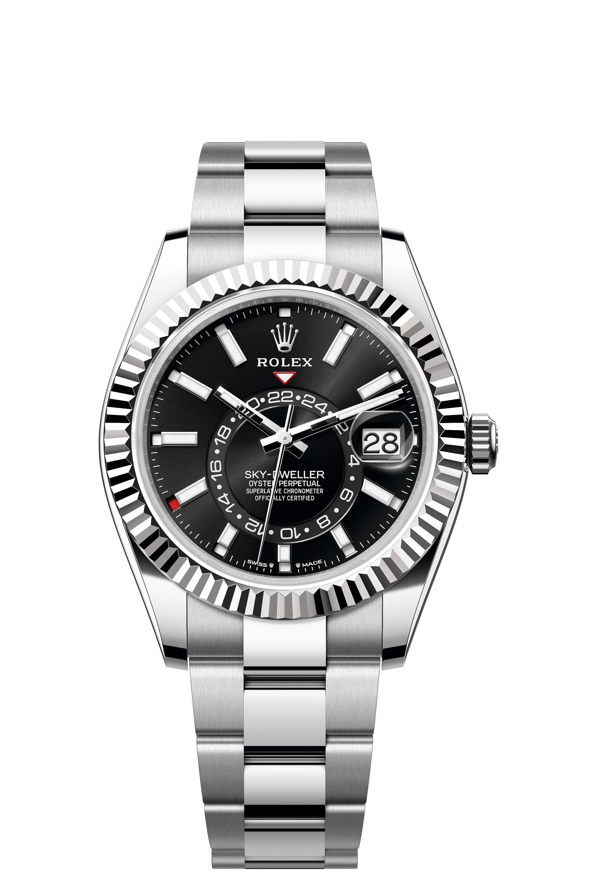 The Oyster Perpetual Sky-Dweller in Oystersteel and white gold with a bright black dial and an Oyster bracelet.