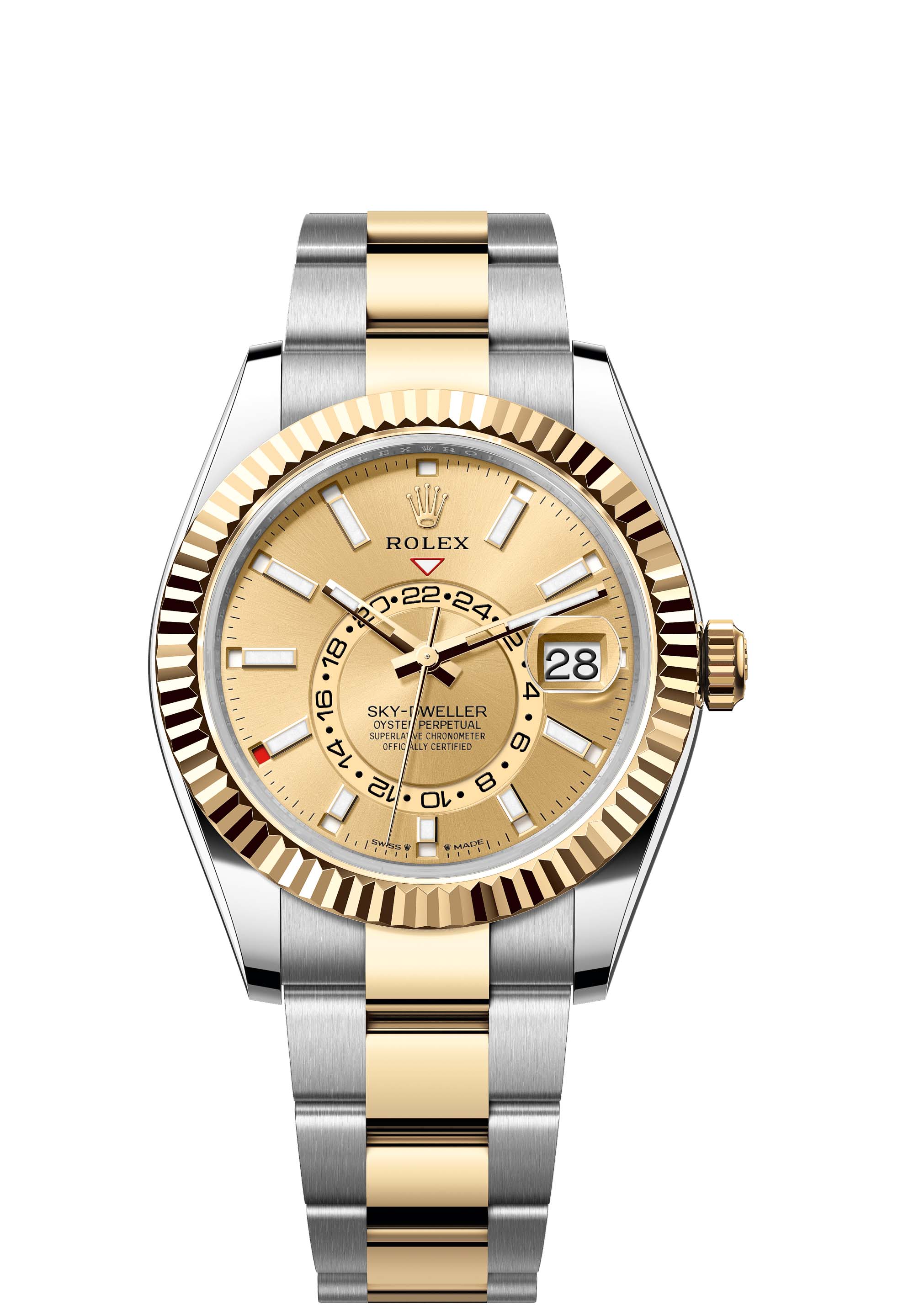 The Oyster Perpetual Sky-Dweller in Oystersteel and yellow gold with a champagne-colour dial and an Oyster bracelet.