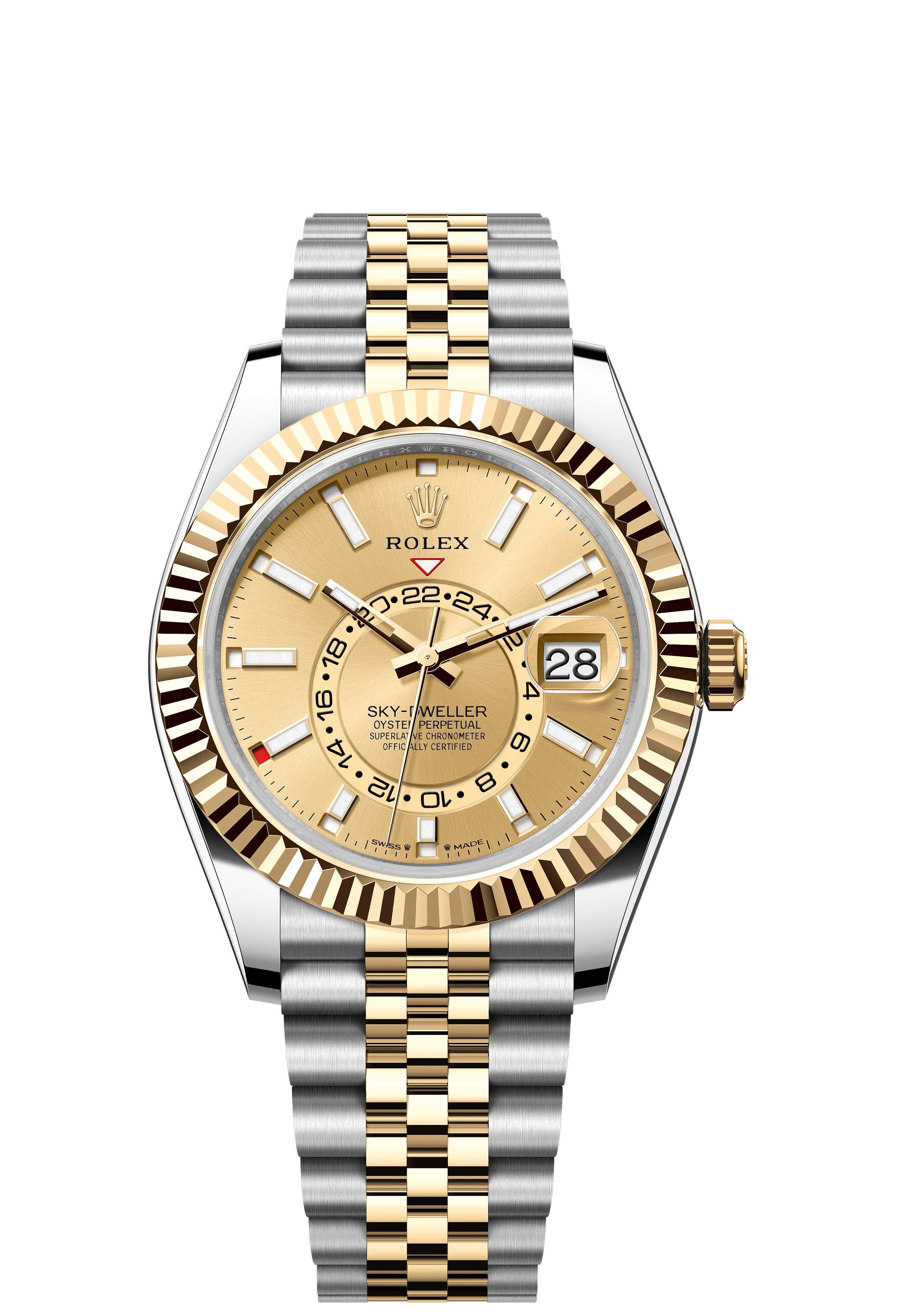 The Oyster Perpetual Sky-Dweller in Oystersteel and yellow gold with a champagne-colour dial and a Jubilee bracelet.
