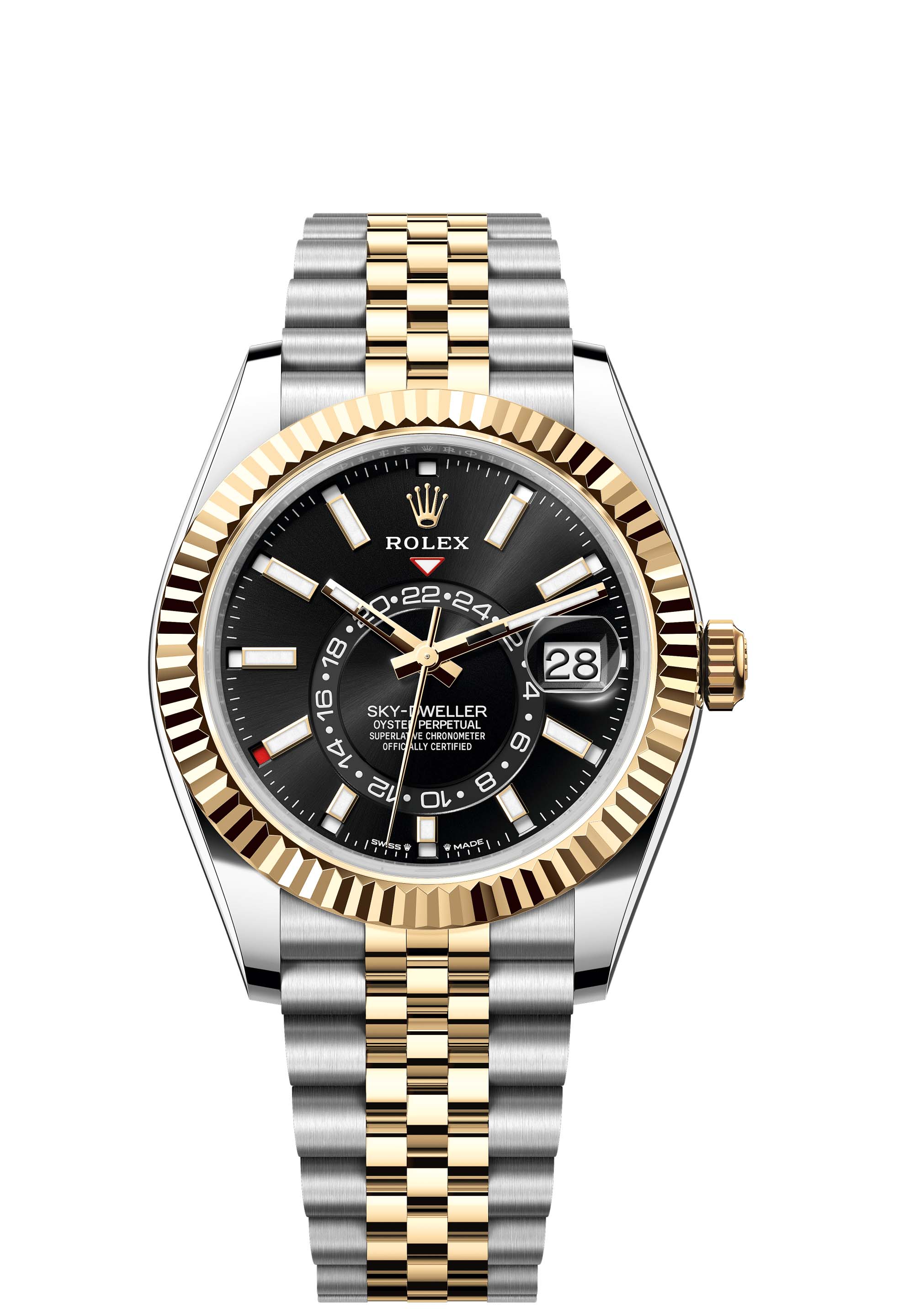 The Oyster Perpetual Sky-Dweller in Oystersteel and yellow gold with a bright black dial and a Jubilee bracelet.