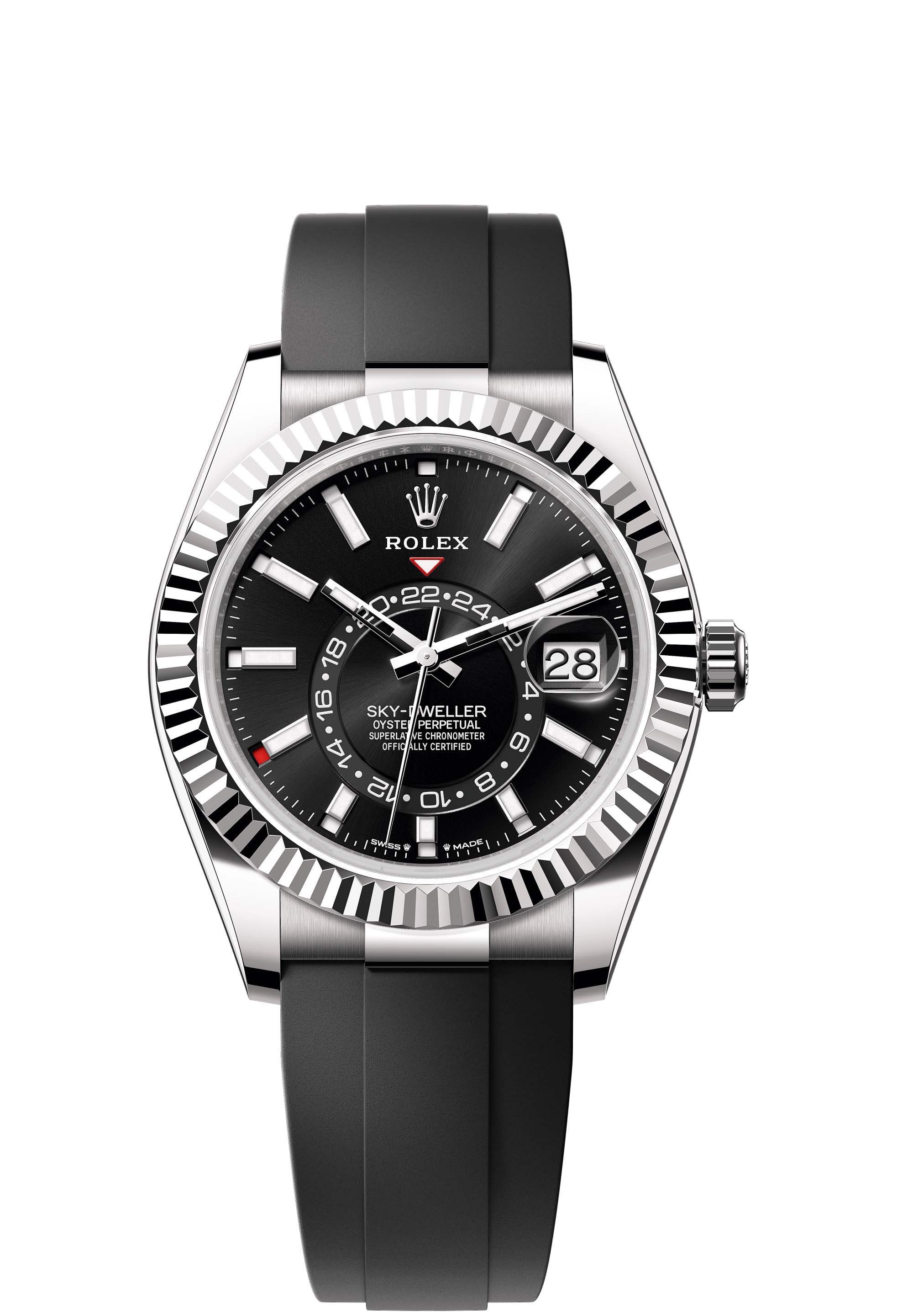 The Oyster Perpetual Sky-Dweller in 18 ct white gold with a bright black dial and an Oysterflex bracelet.