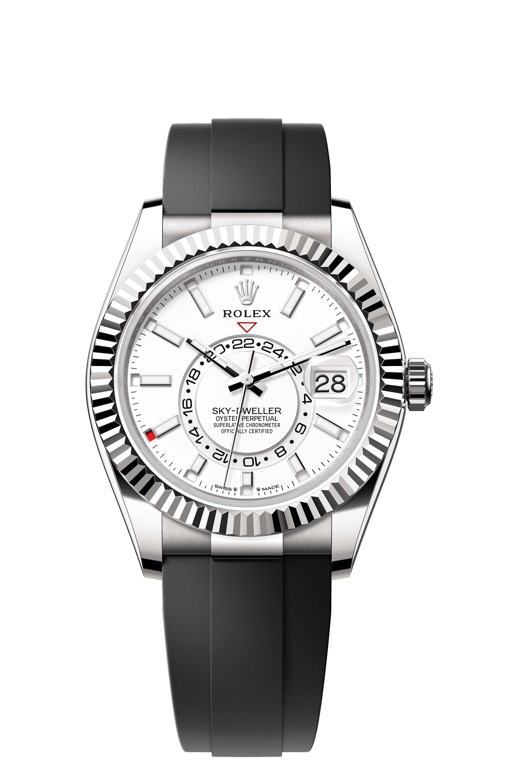 The Oyster Perpetual Sky-Dweller in 18 ct white gold with an intense white dial and an Oysterflex bracelet.