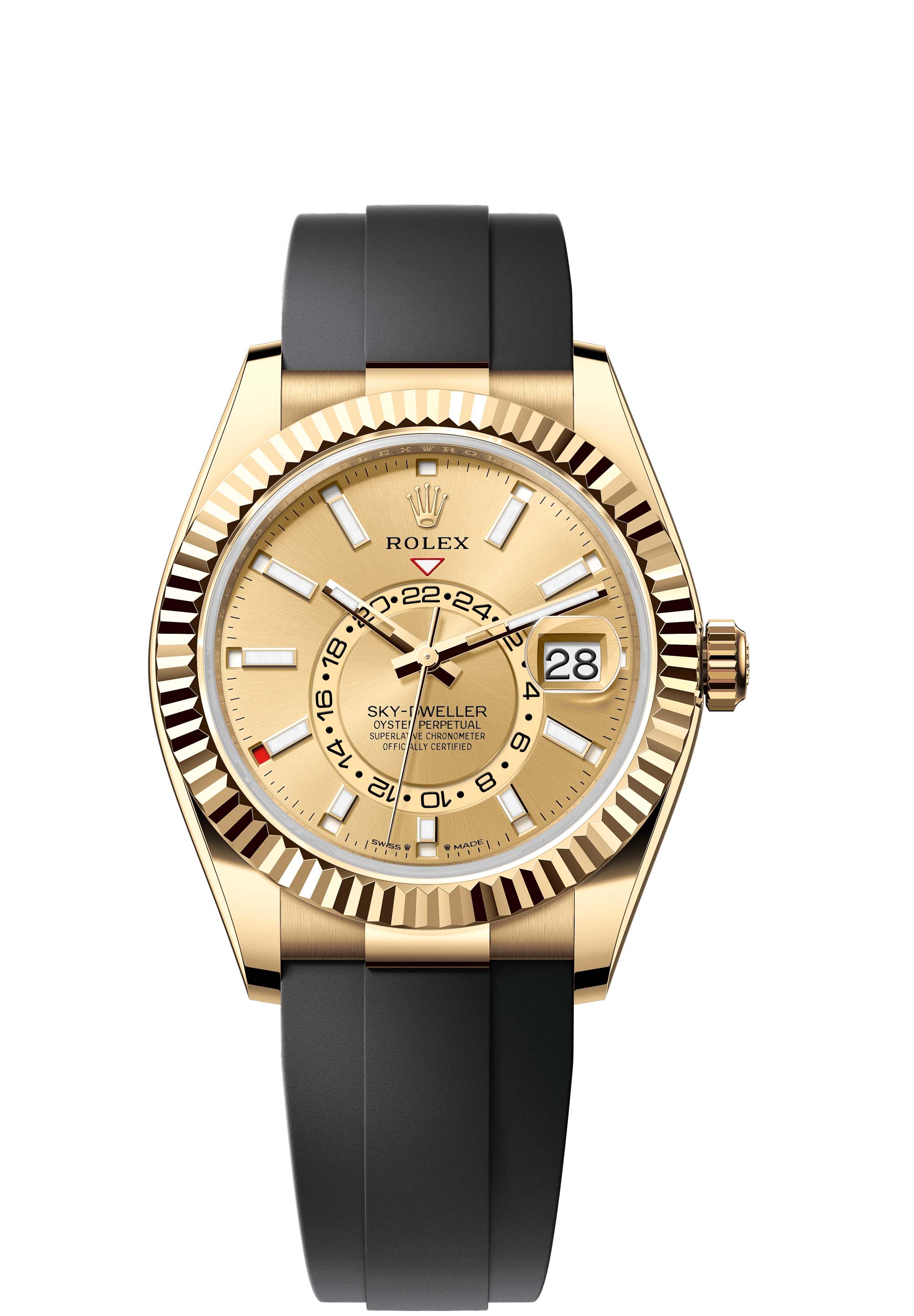 The Oyster Perpetual Sky-Dweller in 18 ct yellow gold with a champagne-colour dial and an Oysterflex bracelet.
