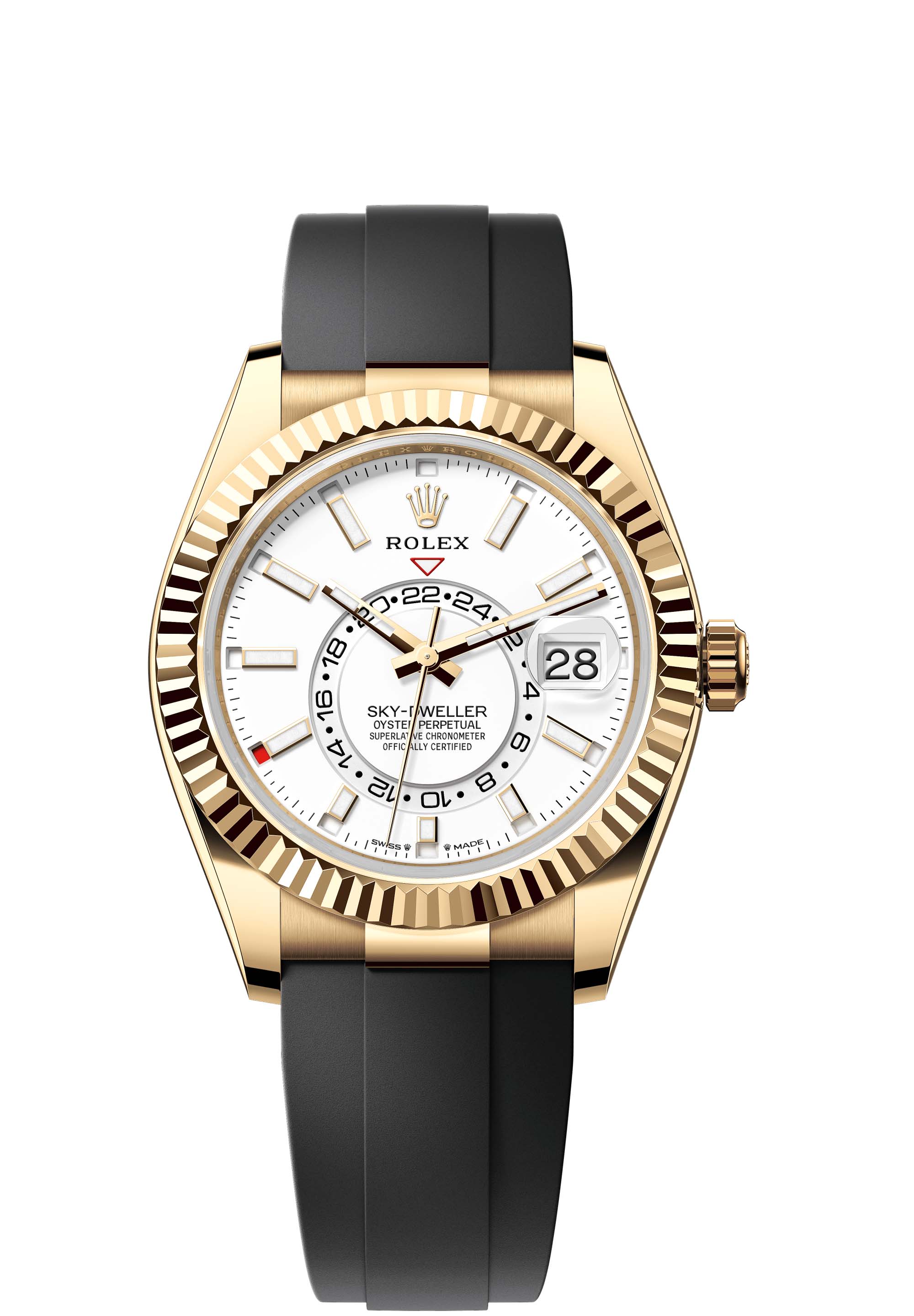 The Oyster Perpetual Sky-Dweller in 18 ct yellow gold with an intense white dial and an Oysterflex bracelet.