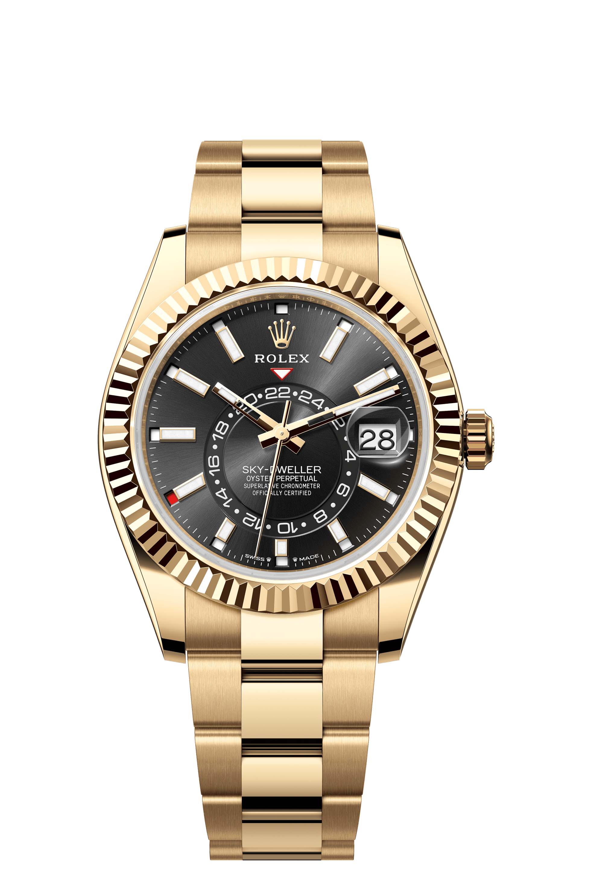 The Oyster Perpetual Sky-Dweller in 18 ct yellow gold with a bright black dial and an Oyster bracelet.