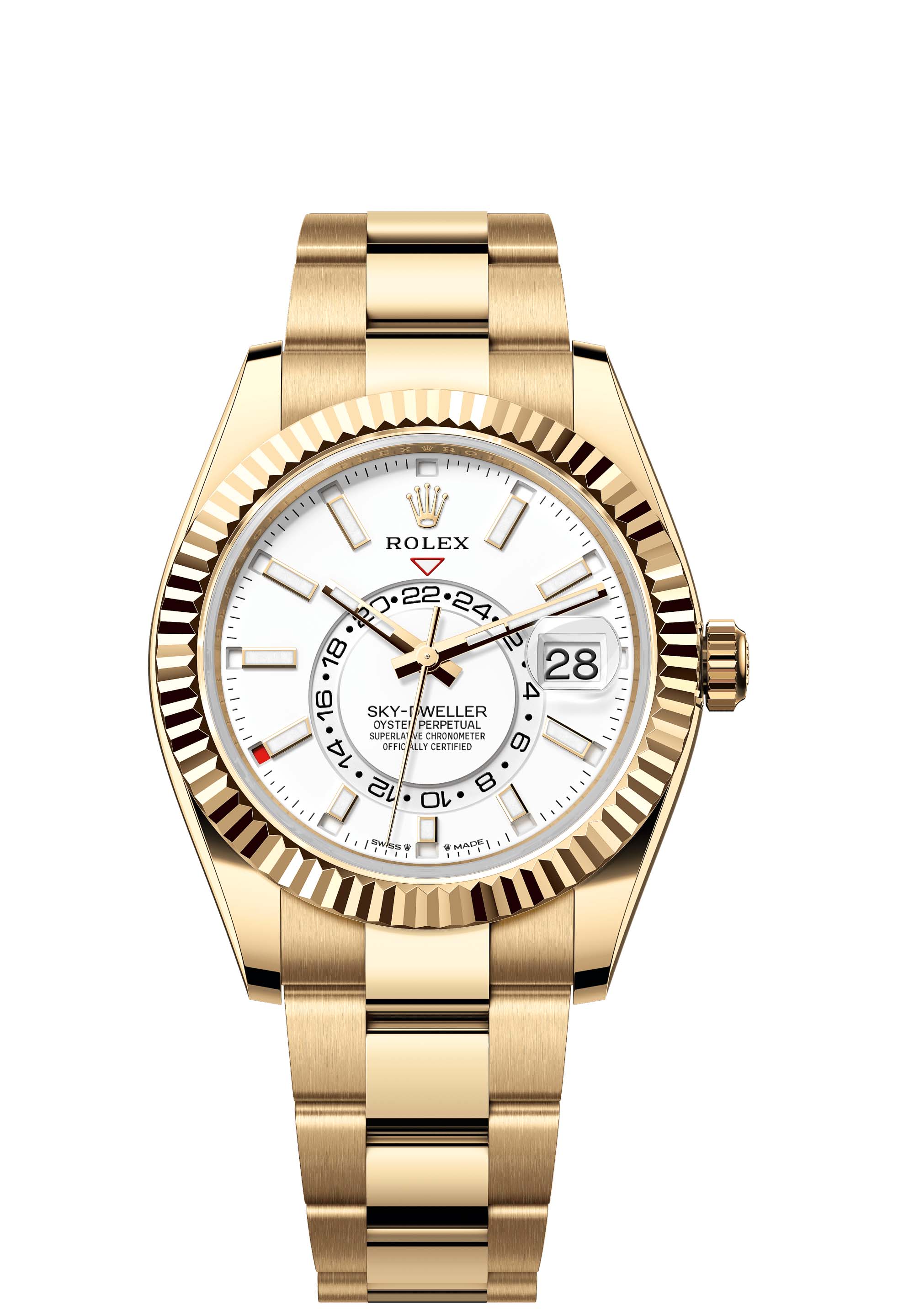 The Oyster Perpetual Sky-Dweller in 18 ct yellow gold with an intense white dial and an Oyster bracelet.