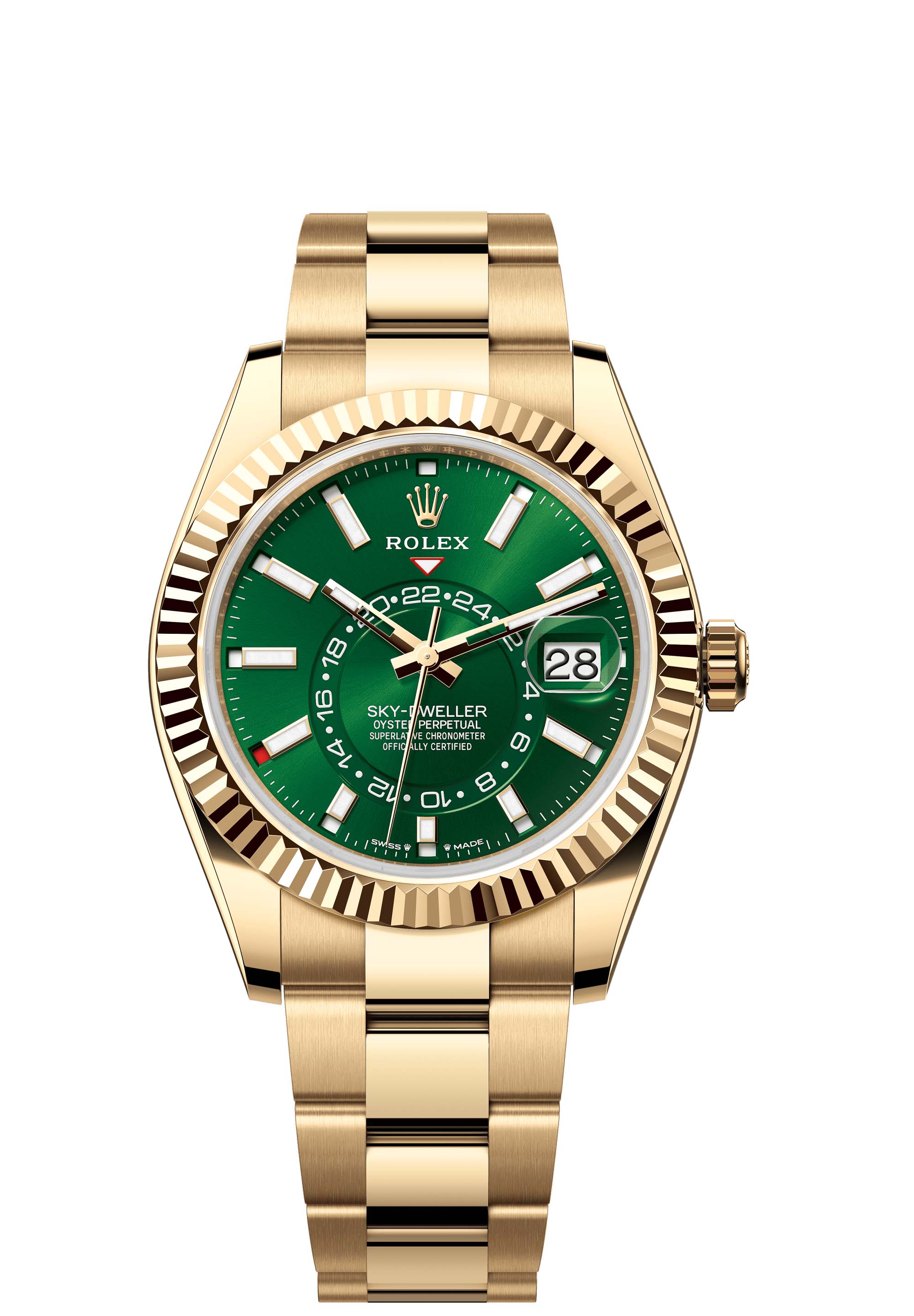The Oyster Perpetual Sky-Dweller in 18 ct yellow gold with a bright green dial and an Oyster bracelet.