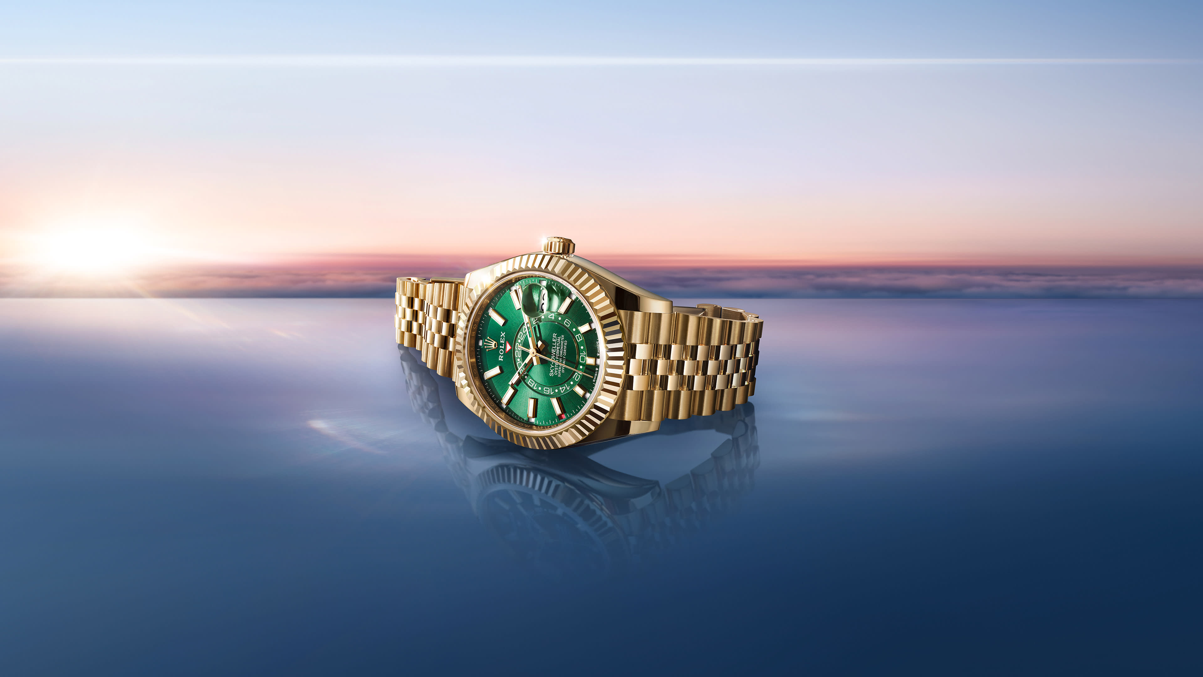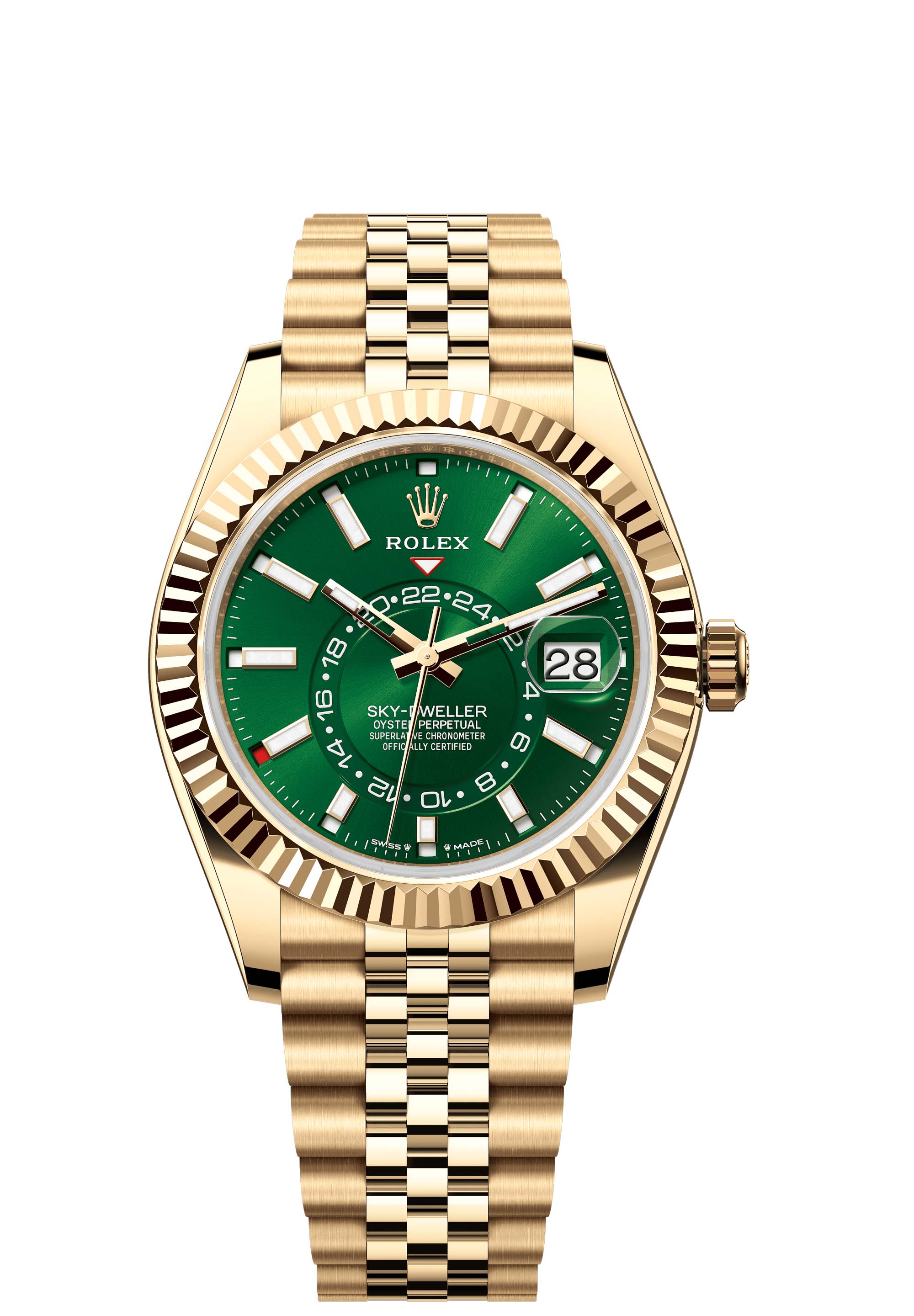 The Oyster Perpetual Sky-Dweller in 18 ct yellow gold with a bright green dial and a Jubilee bracelet.