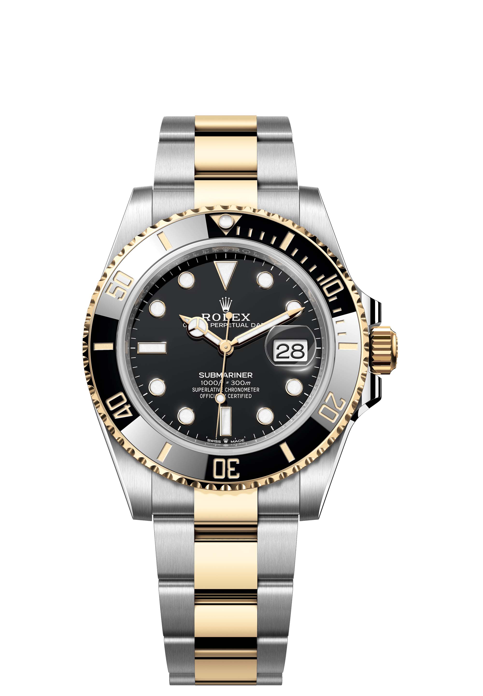 The Oyster Perpetual Submariner Date in Oystersteel and yellow gold with a Cerachrom bezel insert in black ceramic and a black dial with large luminescent hour markers.