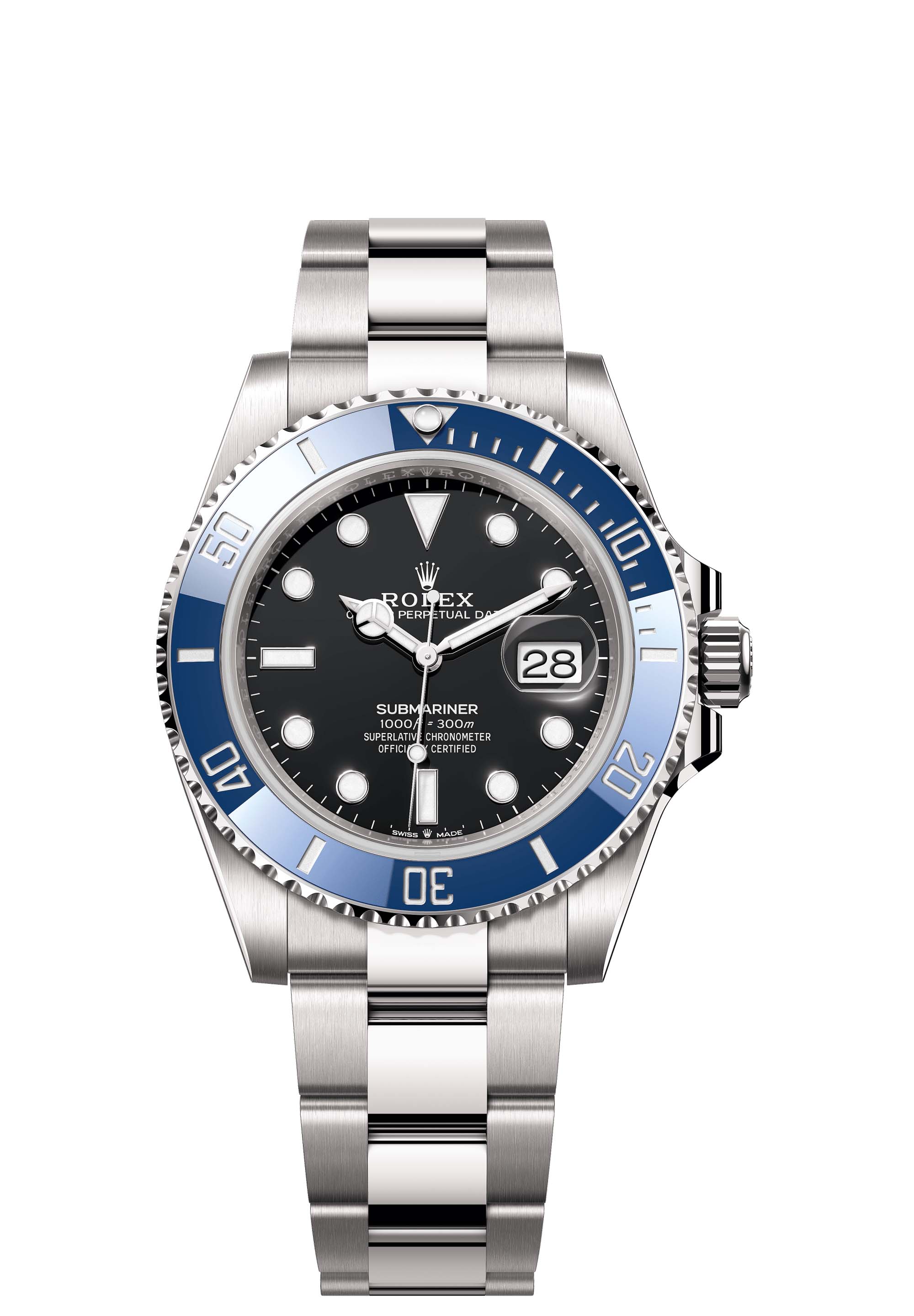 The Oyster Perpetual Submariner Date in 18 ct white gold with a Cerachrom bezel insert in blue ceramic and a black dial with large luminescent hour markers.