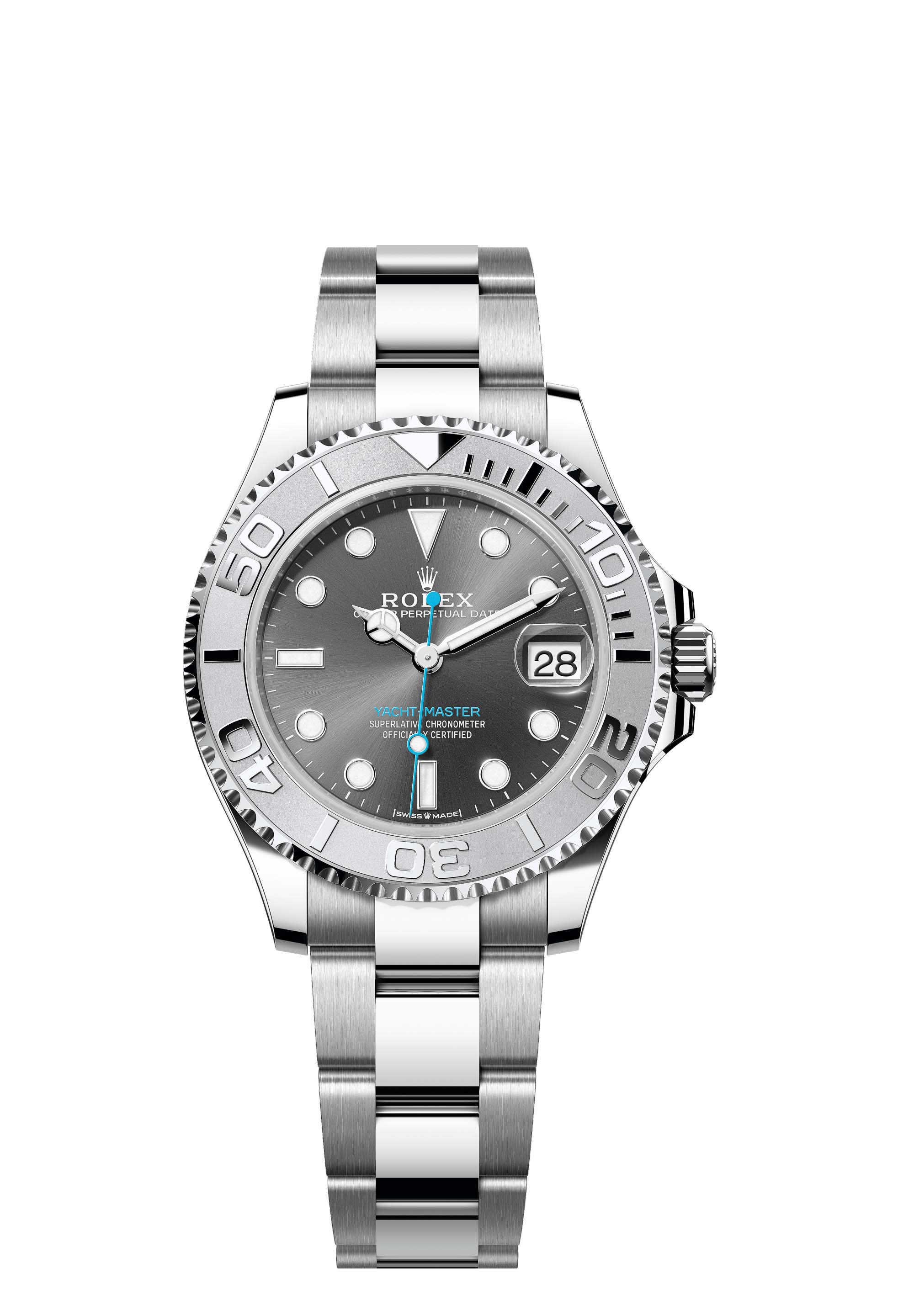 Many Rolex watches are available with the now-legendary combination of yellow, white or Everose gold and steel known as Rolesor, but Rolesium is a creation specific to the Yacht-Master. While the case and bracelet are in rugged Oystersteel, the bezel of the Rolesium versions is made of platinum, imparting a silvery whiteness and vibrant luminosity for an unmistakable sense of luxury.