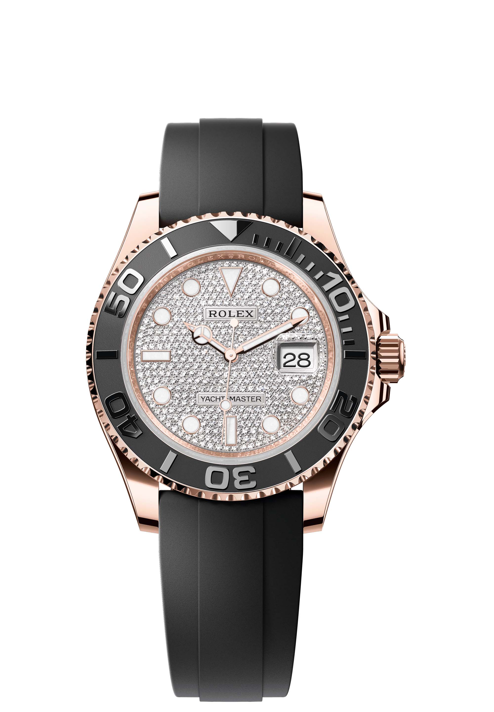 The Yacht-Master’s new Oysterflex bracelet, developed by Rolex and patented, offers a sporty alternative to metal bracelets. The bracelet attaches to the watch case and the Oysterlock safety clasp by a flexible titanium and nickel alloy metal blade. The blade is overmoulded with high-performance black elastomer which is particularly resistant to environmental effects, very durable and perfectly inert for the wearer of the watch. For enhanced comfort, the inside of the Oysterflex bracelet is equipped with a patented longitudinal cushion system that stabilizes the watch on the wrist and fitted with an 18 ct Everose gold Oysterlock safety clasp. It also features the Rolex Glidelock extension system, designed by the brand and patented. This inventive toothed mechanism, integrated beneath the clasp, allows fine adjustment of the bracelet length by some 15 mm in increments of approximately 2.5 mm, without the use of tools.