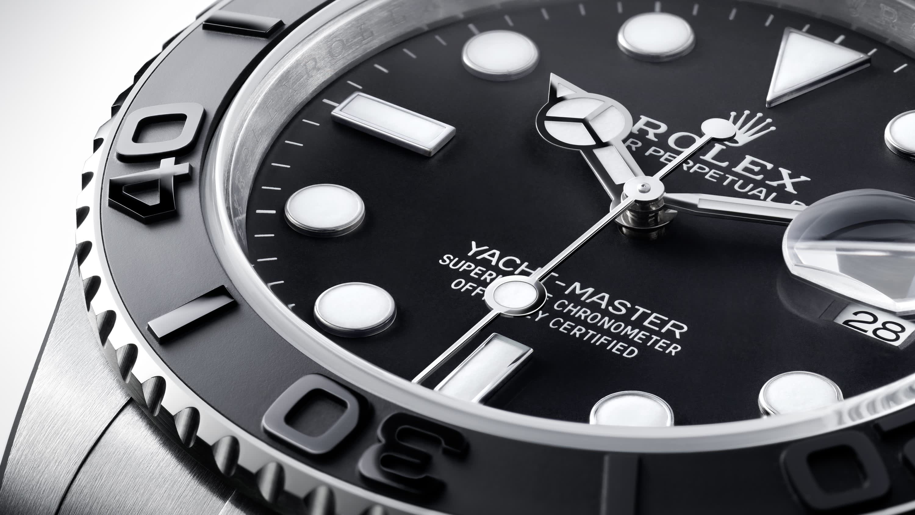 The Yacht-Master’s bidirectional rotatable 60-minute graduated bezel is made entirely from precious metal – Everose gold or platinum – or fitted with a Cerachrom insert in high-tech ceramic, depending on the model. The raised polished numerals and graduations stand out clearly against a matt, sand-blasted background. This functional bezel – which allows the wearer to calculate, for example, the sailing time between two buoys – is also a key component in the model’s distinctive visual identity.